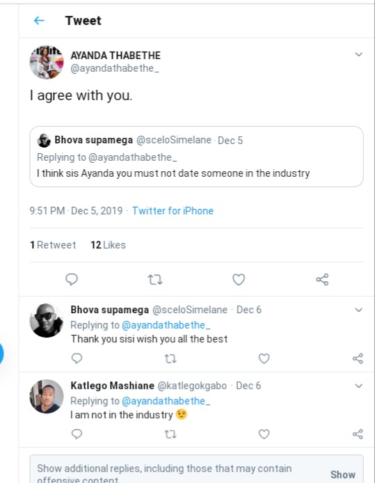 Ayanda Thabethe Responds To A Fan Advising Her Not To Date In The Entertainment Industry.