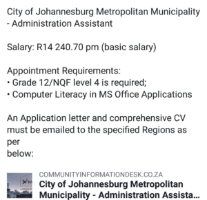 Home/Opportunities/Administration Assistant Wanted! Opportunities Administration Assistant Wanted! Facebook X LinkedIn WhatsApp Administration Assistant Wanted At The City of Johannesburg Metropolitan Municipality. Facebook X LinkedIn WhatsApp Show More Share Facebook X LinkedIn WhatsApp Share via Email Print