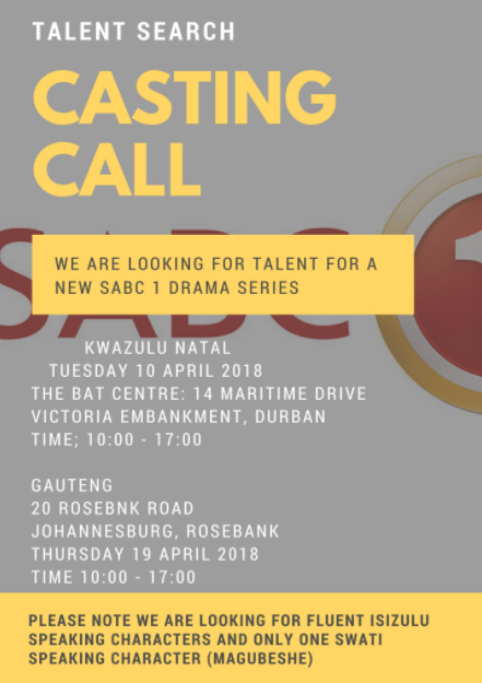 Talent Search Casting Call is looking for talent for a new SABC1 Drama Series.