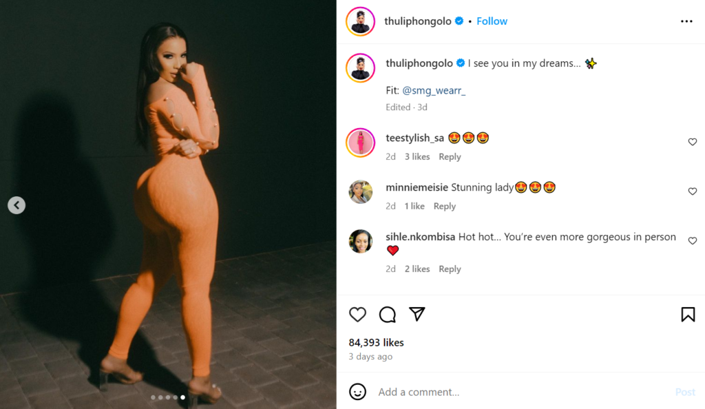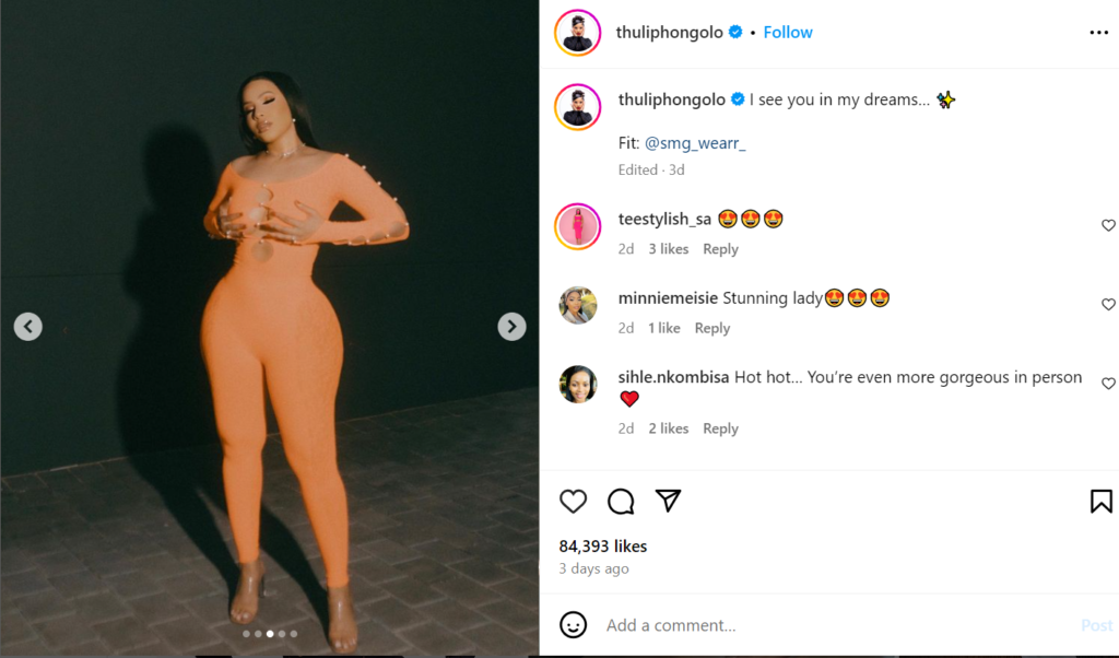 Despite critics, there’s no question that Thuli looks really good. In the frames, she is captured striking fun poses in a hot orange tightfitting jumpsuit, which absolutely displays all the right features of her gorgeous body. It’s a body to die for, and we are for it.