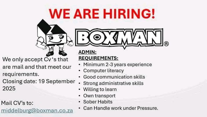 To be considered, please email your CV and relevant documents to: middelburg@boxman.co.za Use the subject line: Application – Admin Position