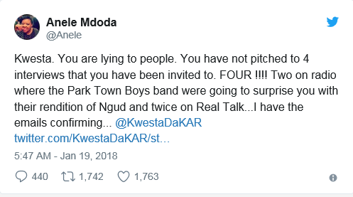 Anele wasted no time and quickly exposed Kwesta. She pointed out that Kwesta was lying and  made sure to remind Kwesta that he has been invited to four interviews, 2 on Real Talk & 2 on radio & that she had the e-mails to prove it.