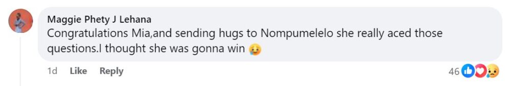 However, as with any major event, there were a few mixed reactions. Some social media users voiced their opinions on the other finalists, with one tweet reading, “Congratulations Mia, and sending hugs to Nompumelelo she really aced those questions. I thought she was gonna win