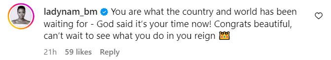 Another fan expressed their excitement on Instagram, “You are what the country and world has been waiting for – God said it’s your time now! Congrats beautiful, can’t wait to see what you do in you reign 👑”
