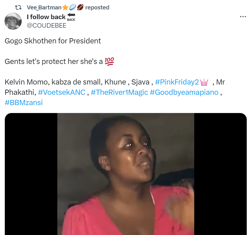 A certain male fan suggested “Gogo Skhotheni for President” in a video tweet that was shared on X. Men in South Africa are becoming increasingly fond of Gogo Skhotheni and concur with her remarks. They believe she’s making a whole lot of sense.
