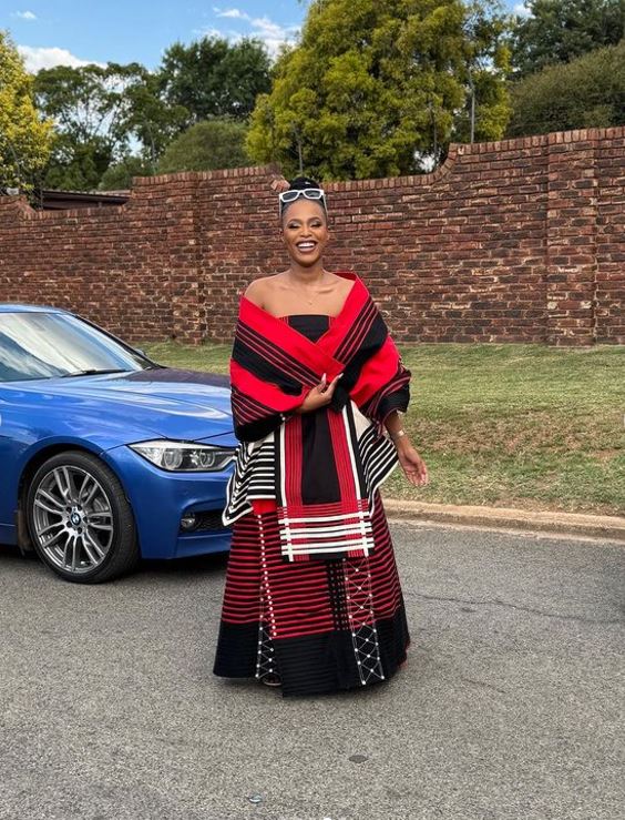 South African actress Natasha Thahane recently left fans awestruck when she appeared in breathtaking Xhosa traditional attire in a striking combination of red and black. Known for her elegance and grace, Natasha’s latest look is a testament to her ability to seamlessly blend modernity with cultural pride. Her outfit not only showcased the beauty of Xhosa heritage but also highlighted her commitment to celebrating and honoring African traditions.