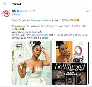 In a tweet from 5FM, Nomzamo Mbatha was described as an artist that is set to dominate the Entertainment industry