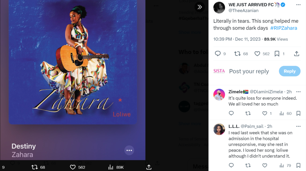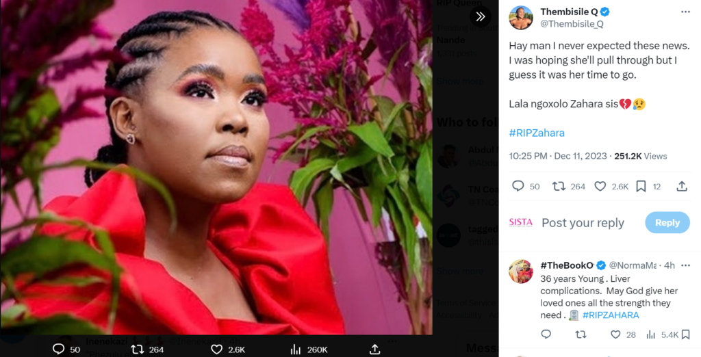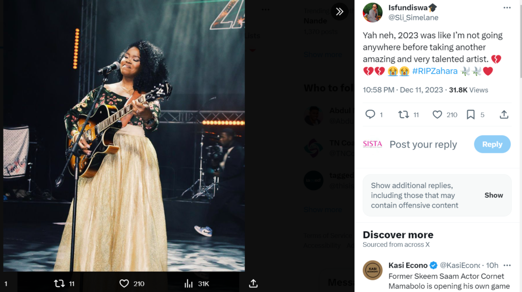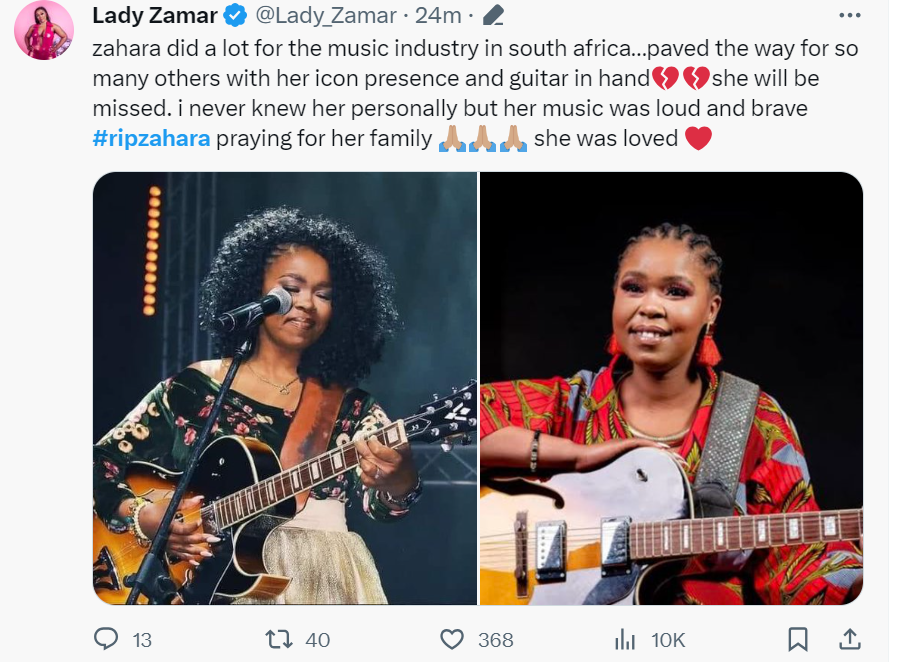 Fellow musician Lady Zamar posted a heartfelt message and paid tribute to the late musician on Twitter (X), writing: “Zahara did a lot for the music industry in South Africa… paved the way for so many others with her icon presence and guitar in hand. She will be missed. I never knew her personally, but her music was loud and brave. Ripzahara is praying for her family. She was love.”