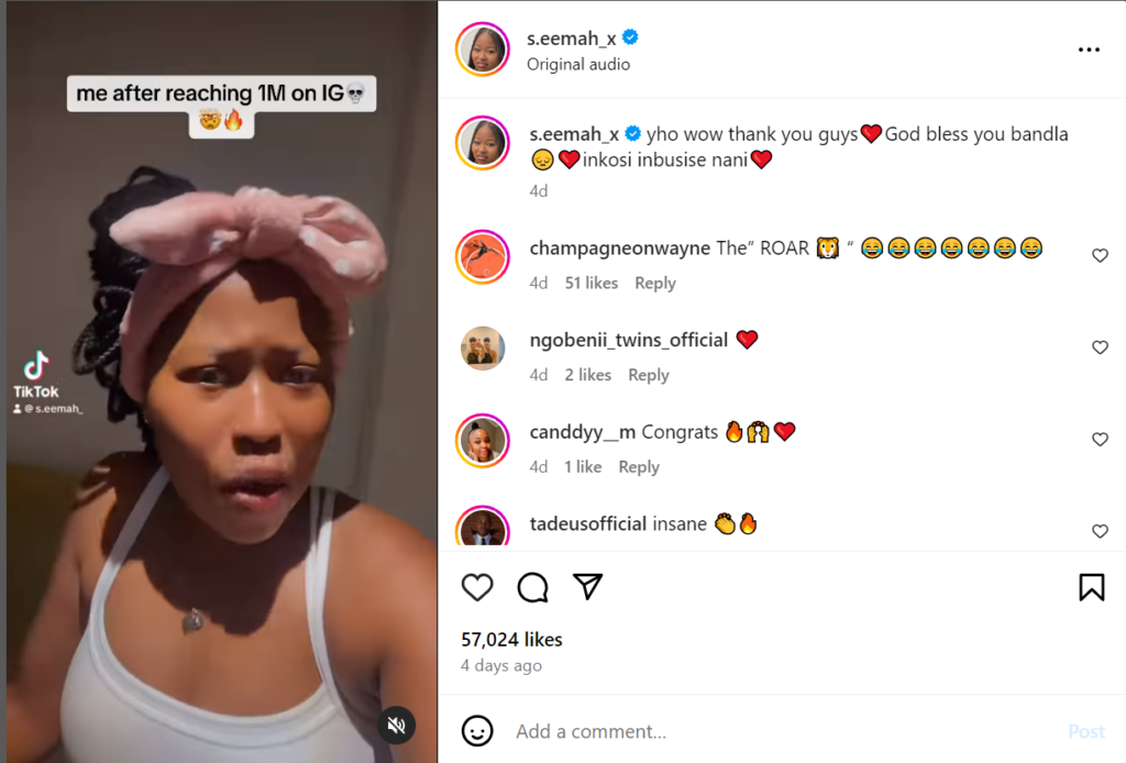 To top it up, Seemah’s boyfriend Ghost Hlubi gifted her with 1 million in cash for reaching 1 million followers on Instagram.