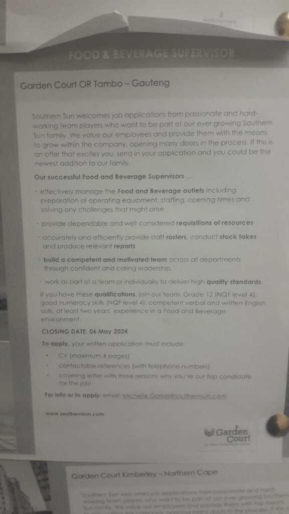 Garden Court OR Tambo Is Looking For A Supervisor.