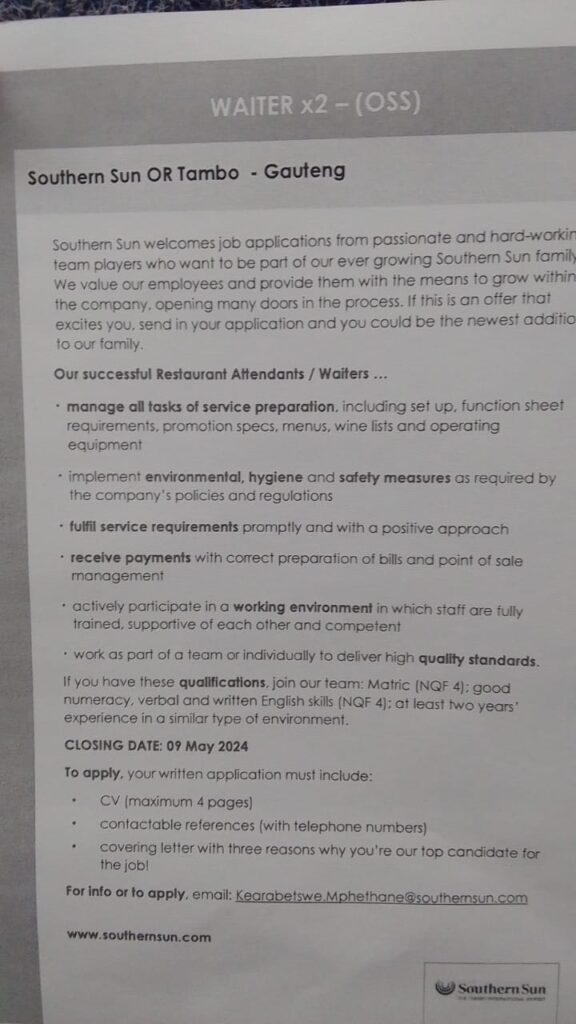 Waitresses Wanted at Southern Sun OR Tambo- Gauteng.